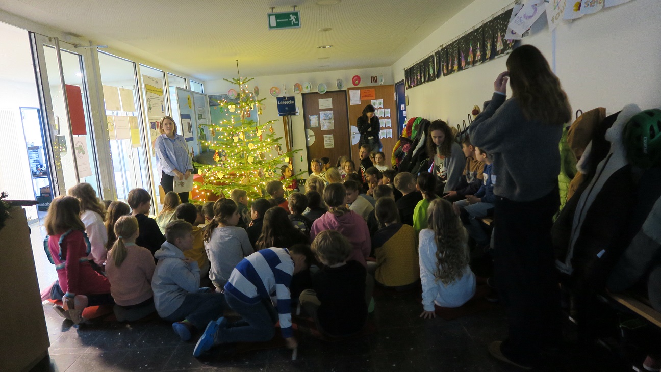 Jeden Montag nach den Adventssonntagen treffen sich alle Kinder der Grundschule Kleinengstingen mit den Lehrkräften beim Christbaum und der Krippe im Eingangsbereich der Schule.