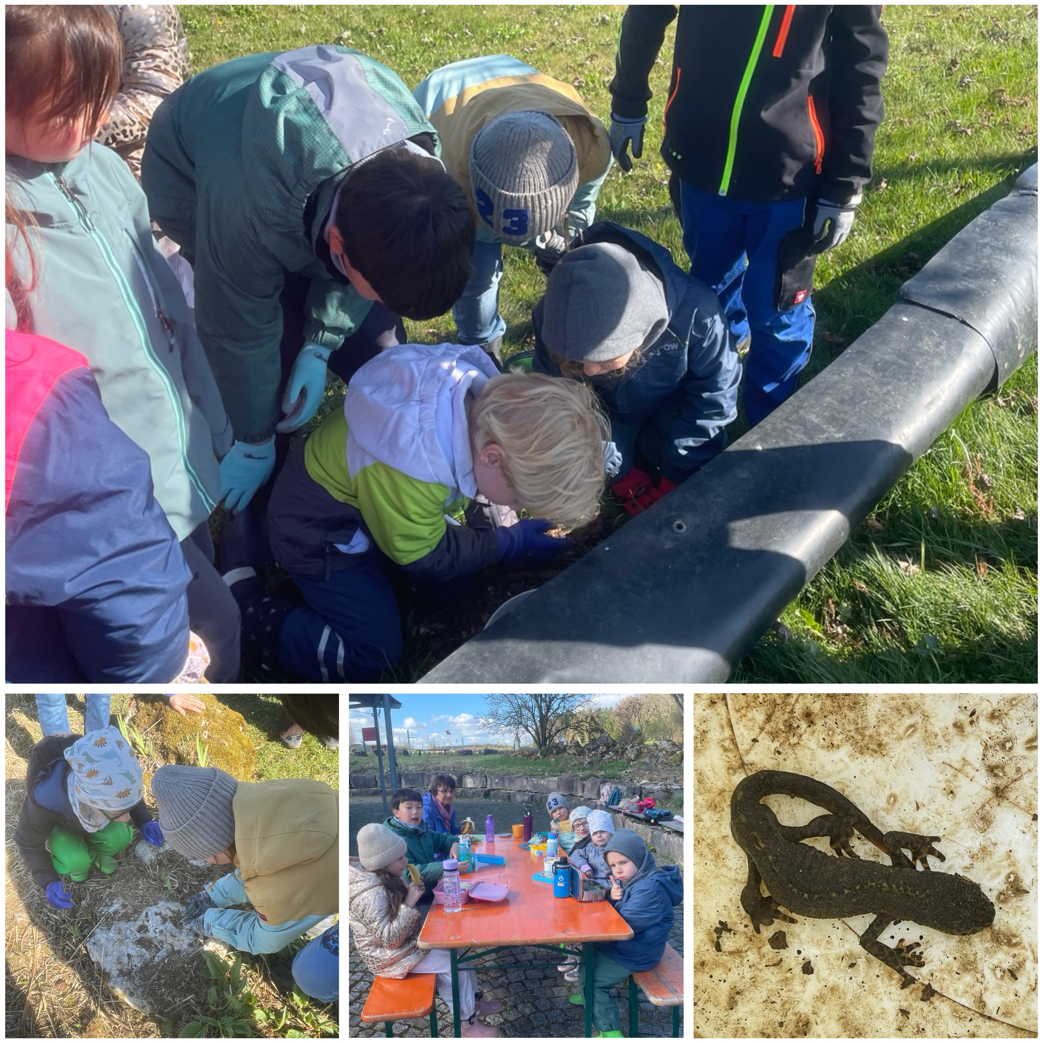 Obwohl die Sonne geschienen hat, war es ziemlich kalt. Amphibien mögen am liebsten warmes, feuchtes Wetter. Ist es kalt, sind sie ganz starr und können sich kaum bewegen. Deshalb haben wir leider nur vier Bergmolche gefunden.Nach der Winterstarre, in der sich die Tiere im Boden eingebuddelt haben, machen sie sich auf den Weg zu ihren Laichgewässern, also zu Teichen, in denen sie ihre Eier ablegen. Hierzu müssen sie eine Straße überqueren, um zu einem Teich zu gelangen. Unsere Aufgabe war es, genau zu beobachten: Welches Tier haben wir gefunden? Ist es ein Männchen oder ein Weibchen? Und in welchem Eimer wurde es entdeckt? Das war gar nicht so einfach!Die Bergmolche hatten alle einen leuchtend orangenen Bauch. Um Männchen und Weibchen zu unterscheiden, mussten wir ganz genau hinschauen. Die Männchen konnte man an den Seiten und am Rücken an ihren kleinen blauen Punkten erkennen. Sie haben ein besonderes Muster, während die Weibchen eher schlichter aussehen.Außerdem haben wir erfahren, warum die Tiere dabei Hilfe brauchen: Auf ihrem Weg müssen sie oft Straßen überqueren, und viele werden von Autos überfahren. Deshalb stellen Helfer Zäune auf und sammeln die Amphibien ein, um sie sicher auf die andere Straßenseite zu bringen.Wir haben auch gelernt, wie wichtig es ist, vorsichtig mit den Tieren umzugehen. Man sollte sie nur mit Handschuhen anfassen, damit ihre empfindliche Haut geschützt wird.Nach der Suche stärkten wir uns zunächst bei einem gemütlichen Picknick im Freien. Bei schönem Wetter konnten alle die Pause genießen.Anschließend hatte Frau Zössmayr selbstgebastelte „Kröten“ versteckt, die wir suchen mussten. Auf jeder Kröte befand sich eine Aufgabe, die wir danach gemeinsam lösten, z.B. Gegenteile benennen oder Aufgaben um unsere mathematische Wahrnehmung zu schulen.Zum Abschluss gab es ein Bewegungsspiel: Frau Zössmayr las eine Geschichte über Kröten vor. Immer wenn das Wort „Kröten“ fiel, mussten die Kinder, die die Kröten darstellten, von einer Seite zur gegenüberliegenden Seite rennen – quasi symbolisch eine Straße überqueren. Ein Kind war der „Krötenretter“ und versuchte dabei, die anderen zu fangen. Wer gefangen wurde, wurde selbst zum „Krötenretter“ und half anschließend beim Fangen. Das sorgte für viel Spaß und Bewegung.
