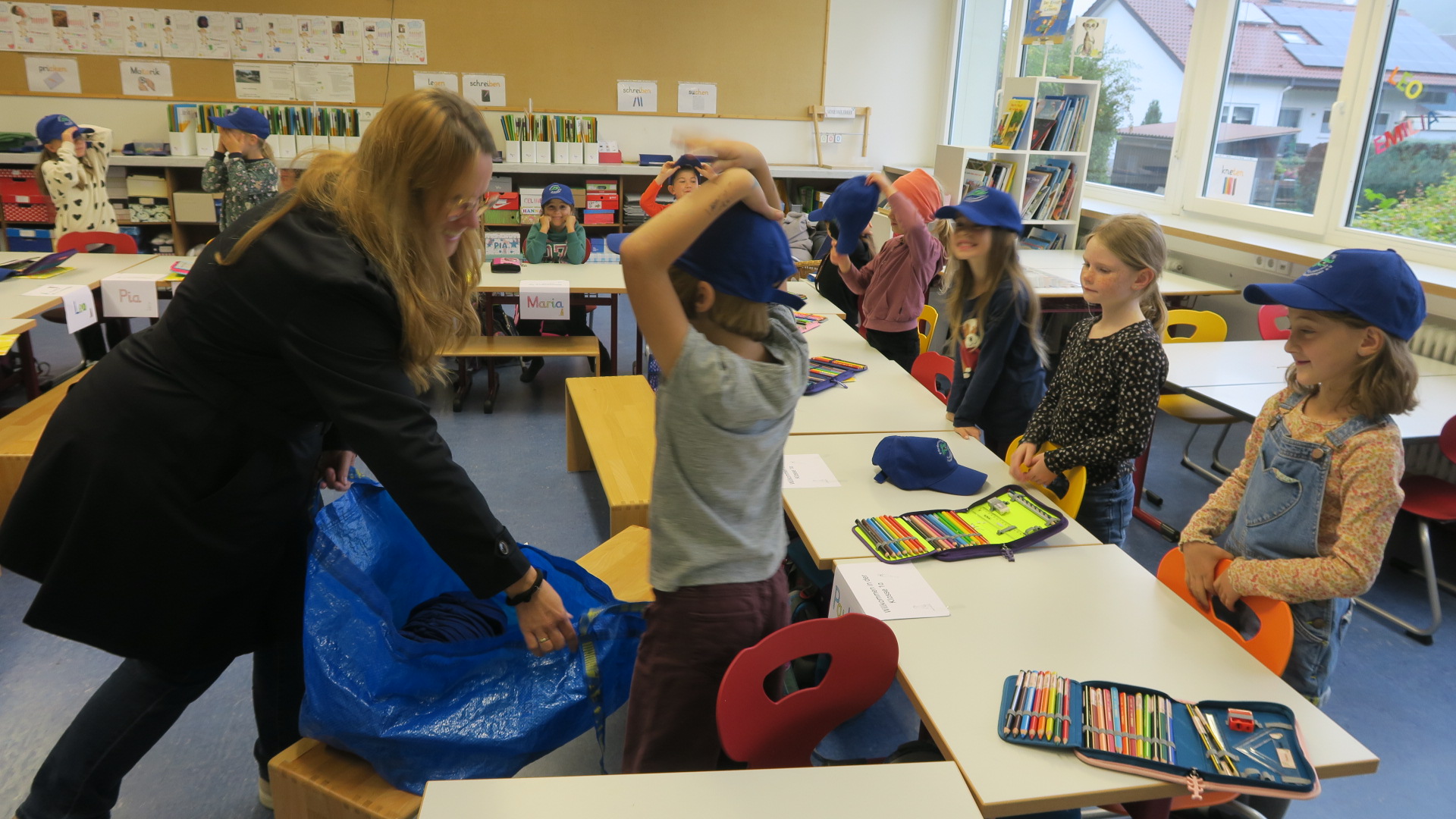 Am Ende ihrer ersten Schulwoche bekamen unsere Erstklässler Besuch von Frau Dr. Simone Rausch, der 1. Vorsitzenden des Schulfördervereins. Im Gepäck hatte sie ein Geschenk für alle Schulanfänger unserer Schule. Jedes Kind der ersten Klasse erhielt eine Schildmütze des Fördervereins. Freudig nahmen die Erstklässler dieses Geschenk entgegen.