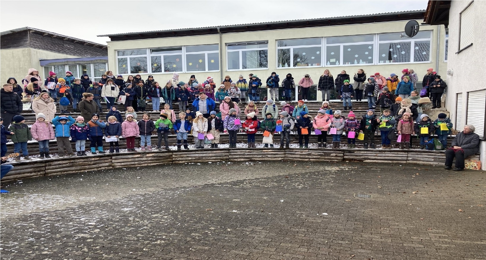 Am Ende des Schultages versammelten sich alle Kinder in der Arena um sich im Rahmen einer kleinen Feier in die Weihnachtsferien zu verabschieden. Gemeinsam wurden Weihnachtslieder gesungen. In diesem Rahmen wurde auch Frau Reiff verabschiedet - für die das Leben ihr eigenes Wunder bereit hält - in den Mutterschutz und anschließende Elternzeit verabschiedet.
